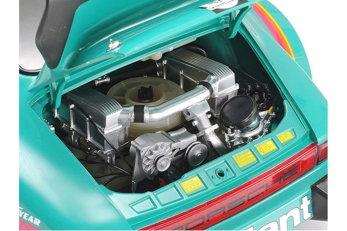 This massive 1/12 scale model car kit recreates the iconic Porsche 934 with the Vaillant livery. From 1976, the commercially sold race car Porsche Turbo RSR was used in World Sportscar Championship races. As it was to be used in Group 4 GT class and the 930 Turbo was its base, it was called the 934. Its 2,993cc flat-6 turbo-charged engine thumped out an impressive 485hp with 62kg/m of torque. One of the 934 racecars was run in the 1976 DRM (German Racing Championship) by Kremer Racing. The cobalt green car took three victories that season, carrying driver Bob Wollek to the top of the Division 1 drivers’ standings.