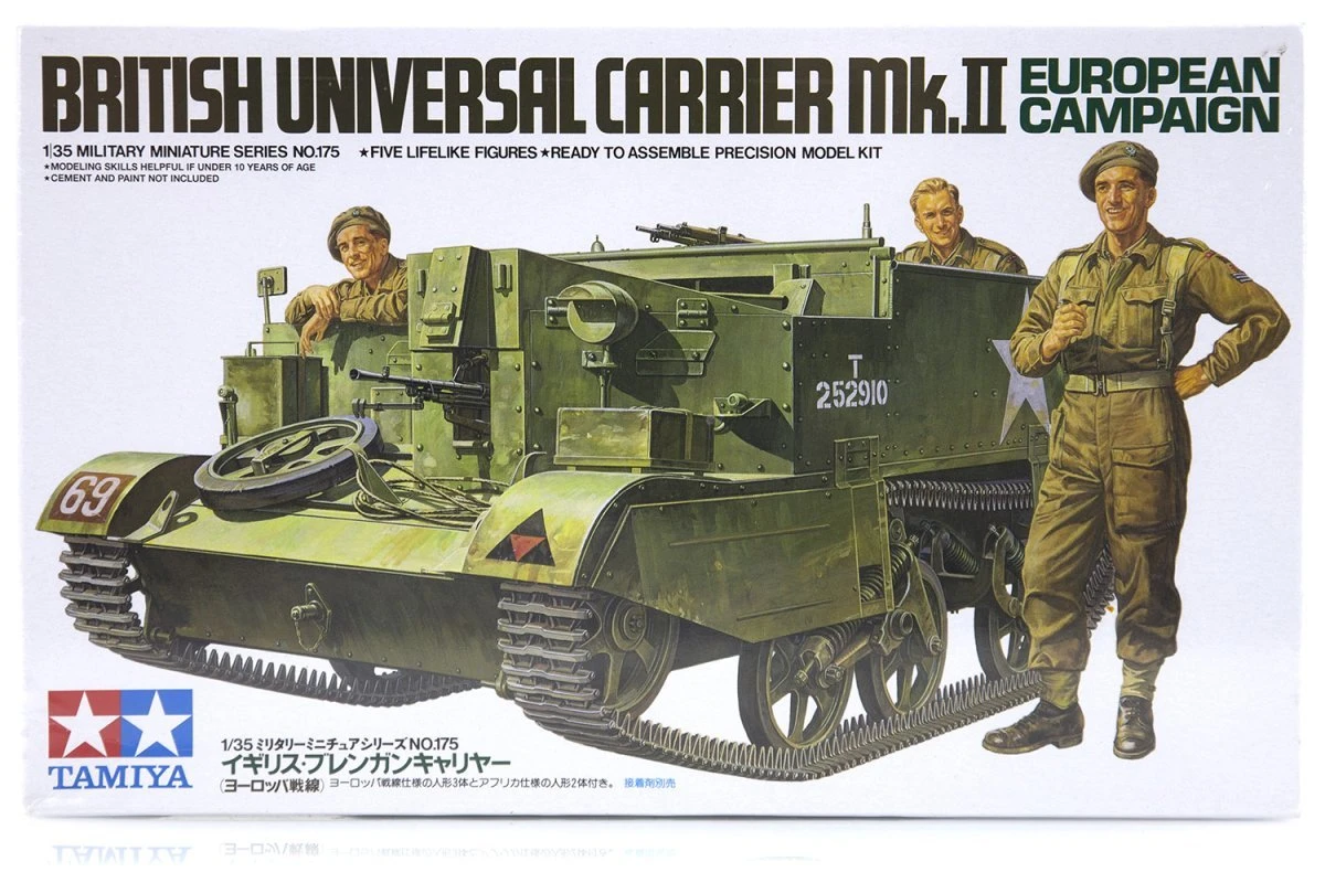 During World War II, Great Britain and its commonwealth Armies used a vast number of small sized, fully tracked weapons carriers, while the American and German forces relied mainly on half-tracks and wheeled transport. Development of these fully tracked carriers dates back to 1925 when Major (later Lieutenant-General Sir Gifford) Martel constructed a one-man “tankette” to interest the British War Purchasing Office. Since then, variations consisted of machine gun carrier, mortar carrier, light gun tractor etc. These weapons were built by several firms, and although built for specific purposes, they did serve in the early days of the conflict. Experiences at the front however, showed a need for a multi-purpose vehicle, capable of a wide range of tasks. Thus the Universal Carrier Mk. I, and the improved Mk. II came into being about 1940. The Universal Carrier had an open top crew compartment on each side of the engine compartment, and a lightly armored superstructure. The Ford V-8 cylinder engine put out 85 brake horsepower and provided a 48km/h of top speed. Armament and stowage were varied according to its mission, but most typically, it carried a Czech designed .303 inch Bren light machine gun (modified and manufactured by Enfield), plus some other small arms. With its high mobility and adaptability, the Universal Carrier proved satisfactory throughout the conflict, from the African desert to the European campaign.