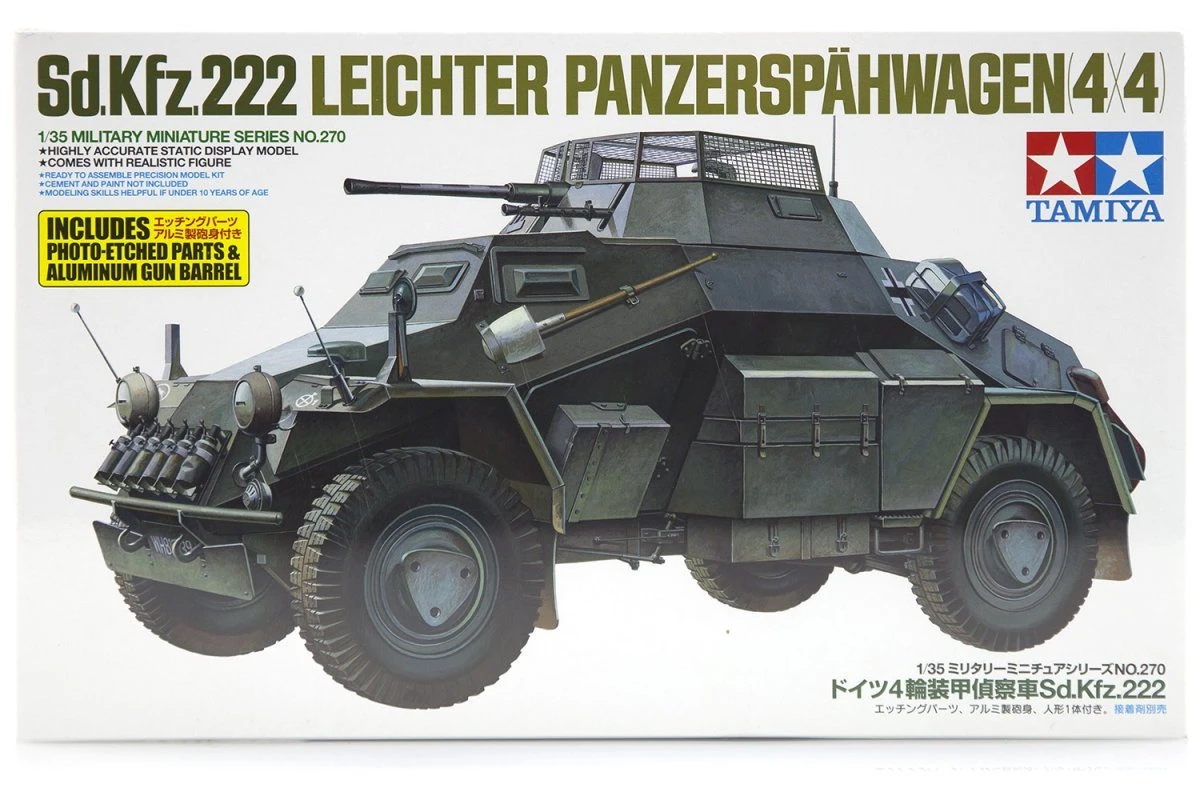 Throughout WWII, Germany carried out an extensive program of armored vehicle development, deploying a vast range of armored vehicles to the front line. Amongst these vehicles, the compact 4WD Sd.Kfz.222 remains one of the most famous and popular. Featuring welded plate armor particular to German vehicles at that time, the Sd.Kfz.222 was fitted with a rotating open top turret protected by grenade deflecting mesh screens. The 222 was equipped with an anti-tank and anti-aircraft 20mm main gun and a 7.92mm machine gun. Featuring a 4WD chassis with fully independent suspension and optional 4-wheel steering, it had a top speed of 90km/h. An exceptional off-road vehicle, the Sd.Kfz.222 was seen on all fronts throughout the middle phases of WWII.