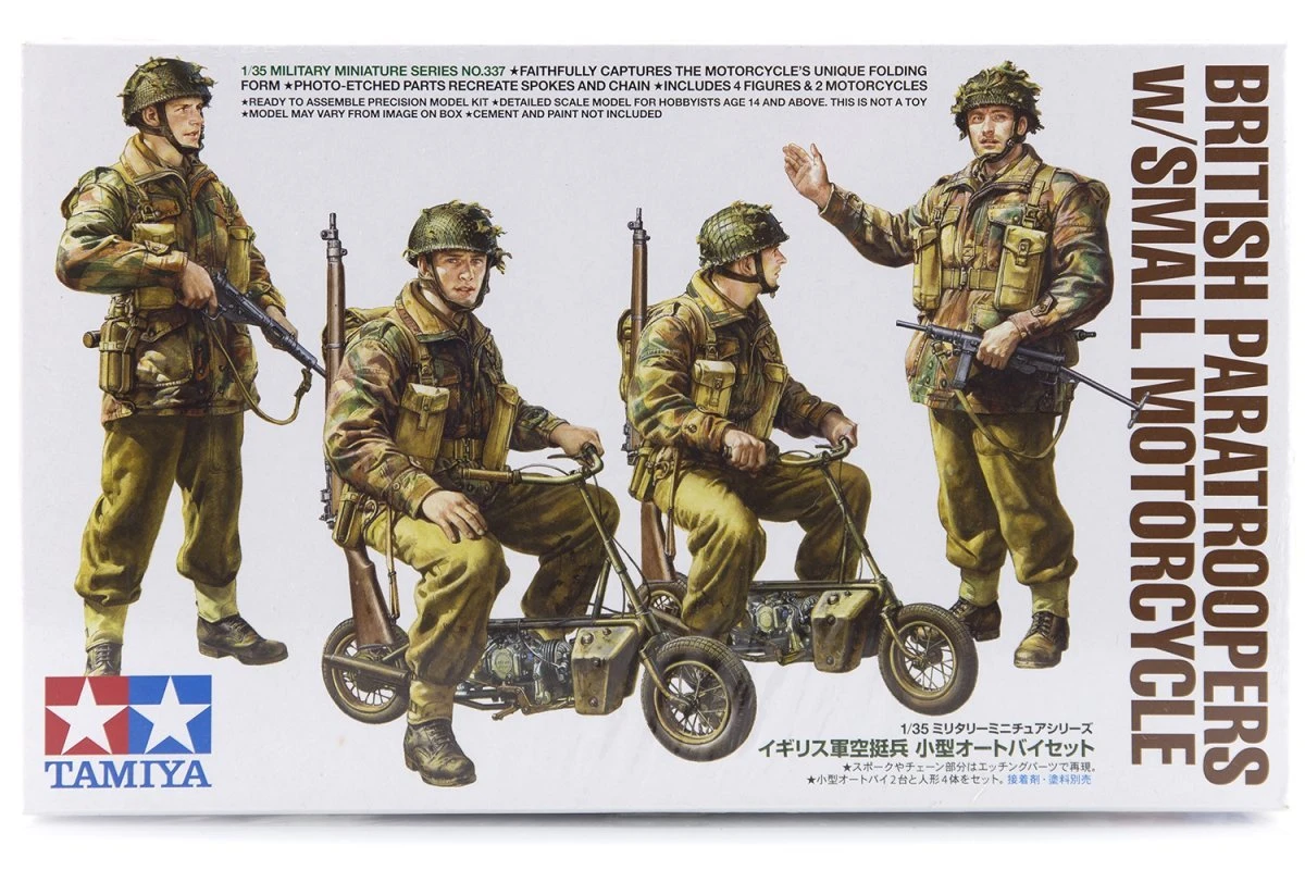 This kit includes 4 British paratrooper figures and 2 small folding motorcycle models in 1/35 scale. The motorcycle was originally developed for the British Special Operations Executive (SOE). Between 1942 and 1943, around 3,600 motorcycles were produced, and were largely distributed to the 1st and 6th Airborne divisions. Thanks to their folding mechanism, they could be packed snugly into small containers and air-dropped so that the paratroopers could use them upon landing. They were employed in the Normandy landings.