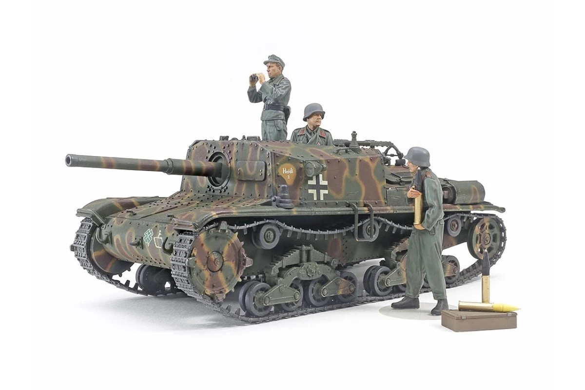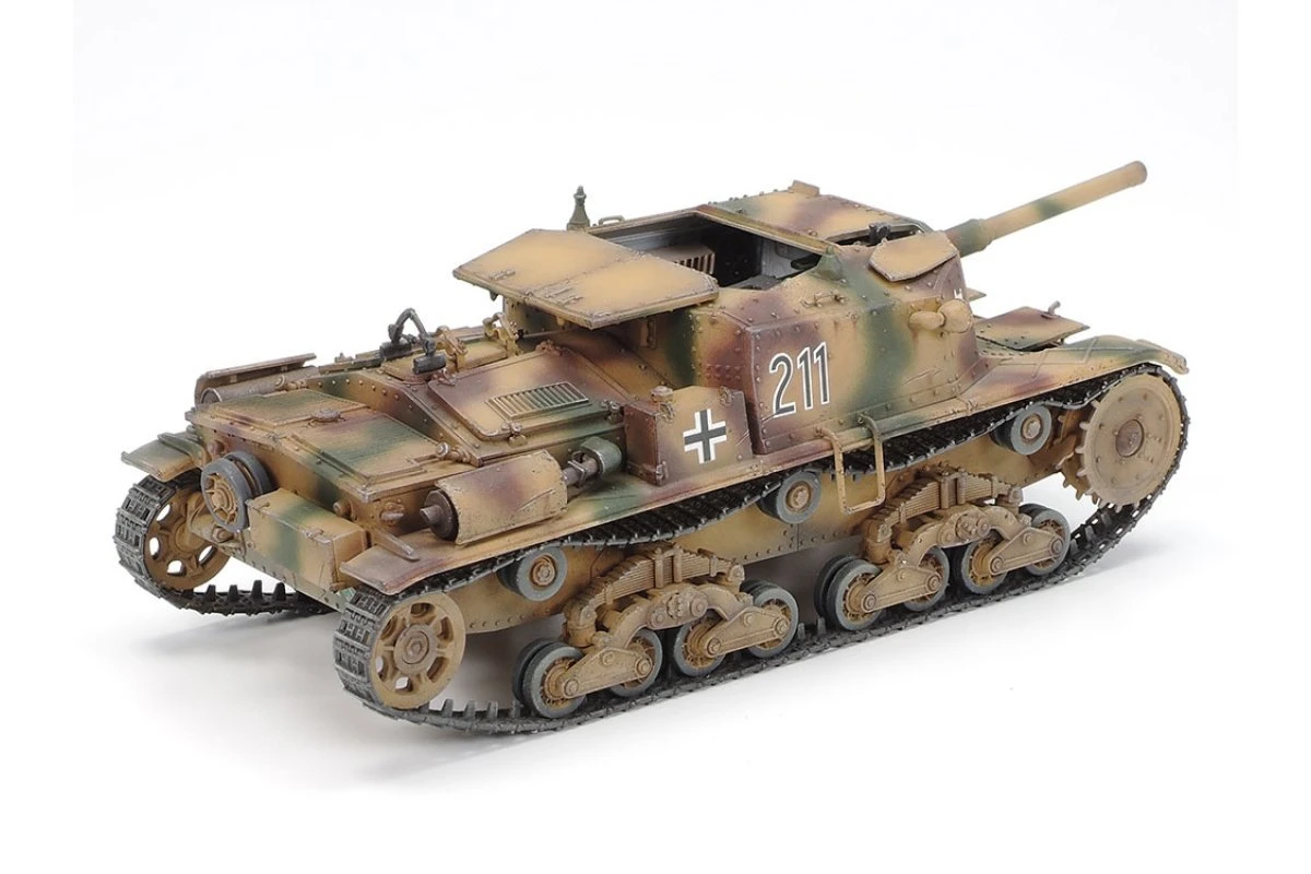 Among the various native armor fielded by Italian forces in WWII, the Semovente M40 da75/18 was perhaps the most successful, and it formed the base for the improved M42 da75/34 depicted by this model. The M15/42 medium tank provided the basic chassis, while superior penetration was achieved by the L/34 75mm gun. Although production began in Spring 1943, most vehicles ended up in German hands following the Italian armistice with the Allies in September of that year. They were mainly deployed in anti-tank units attached to German Infantry Divisions, and their low profile and powerful gun ensured that they were a threat to the enemy, particularly in ambushes; they fought until the German surrender of May 1945.