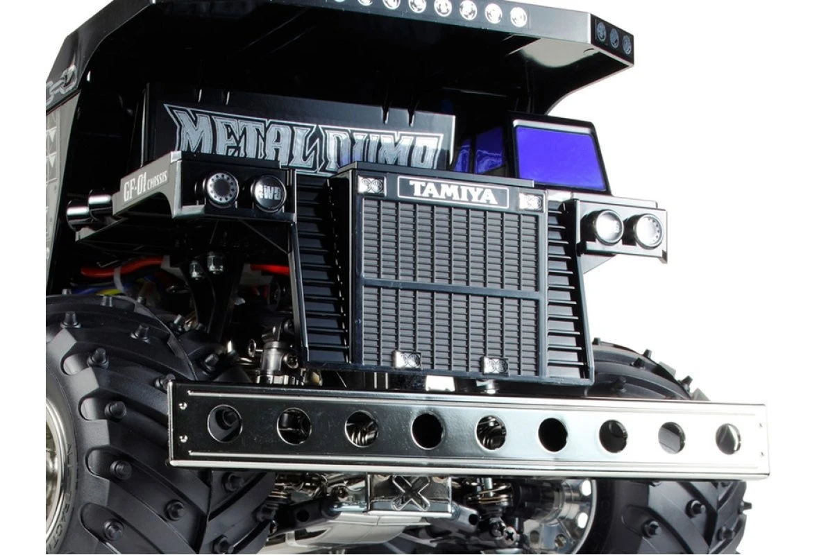 Dump trucks earn their living in some of the toughest workplaces around: large-scale construction sites, mines and quarries to name but a few. This R/C model assembly kit has a unique and exciting color scheme: rather than the yellow typical of such construction vehicles, it is black-based with numerous chrome-plated parts. The cab and rear bed are molded in black, and metallic stickers are provided to depict logos and markings including stud and chain motifs, to give the model some real attitude. Chassis monocoque, front bumper, rear support bar with roller and wheels are all chrome-plated. Spike tires round off the look.