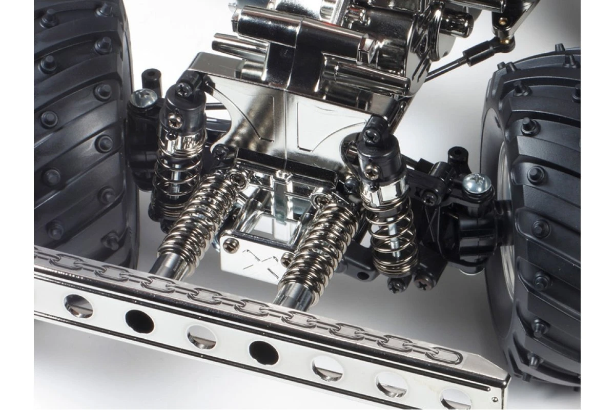 This gear-driven 4WD chassis is based around a lightweight and tough monocoque frame, with power provided by the centrally-positioned motor. It utilizes a ‘square’ setup with similar tread and wheelbase lengths. Sealed gearbox is integrated into the frame and protects from dust and debris, while the built-in front and rear differential gears provide smooth cornering. This is reinforced by 4-wheel double wishbone suspension and friction dampers plus a 2-piece tie rod steering setup with the servo on the left for excellent response. Furthermore, it has chrome-plated wheels to match the chassis, fitted with big 115mm diameter soft compound lug pattern spike tires, plus a rear support bar with roller to prevent the model from flipping.