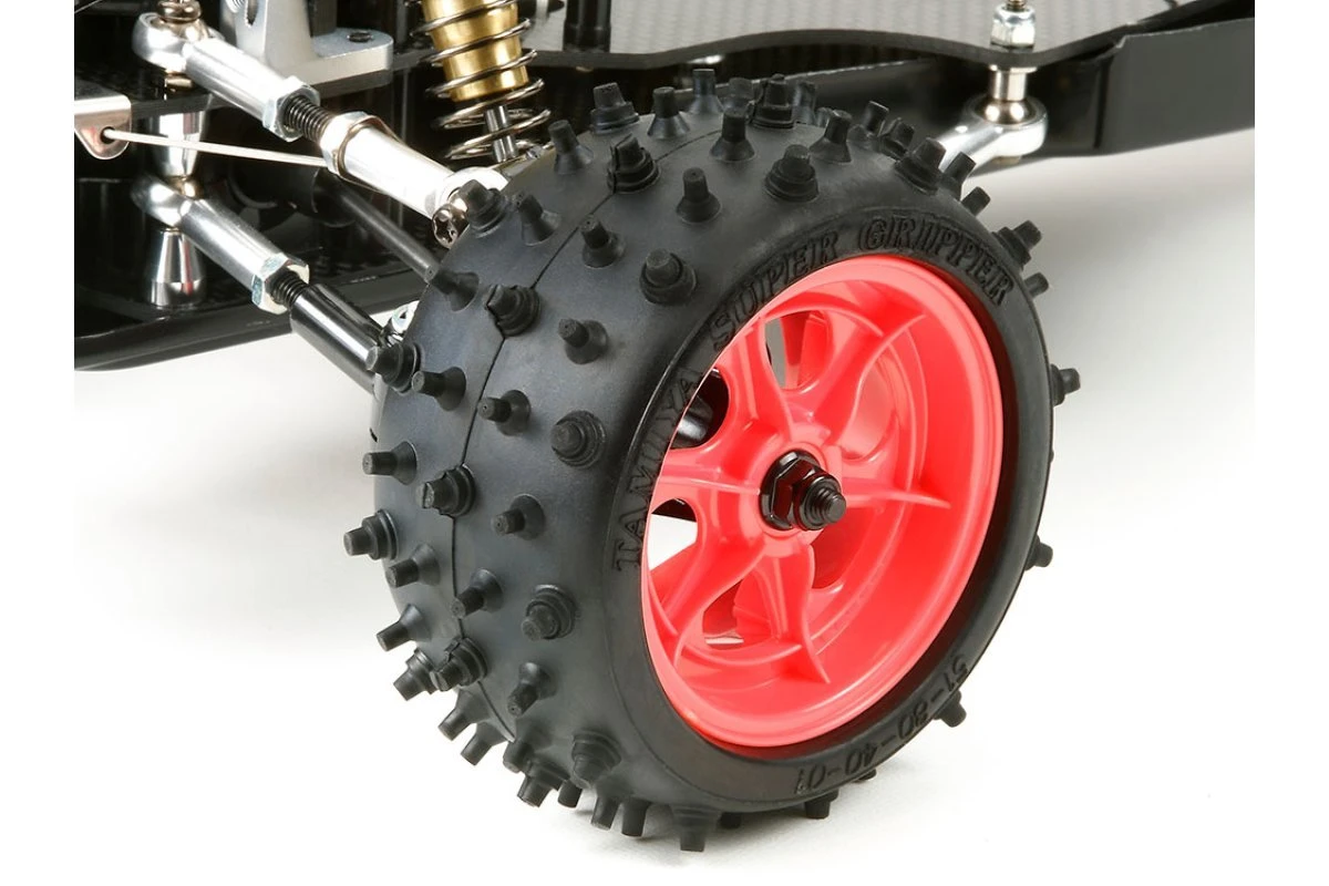 The machine features a unique shaft-driven 4WD system which was taken from Tamiya’s first 4WD R/C buggy, the Hotshot. It features a highly sophisticated design including an FRP double-deck chassis layout, longitudinal motor & battery positions, and a formula-type body with chassis fairing. It is equipped with innovative components such as a compact gearbox with 3 small planetary gears, a centre diff to increase stability, a fully adjustable suspension, and cam-lock wheel caps.