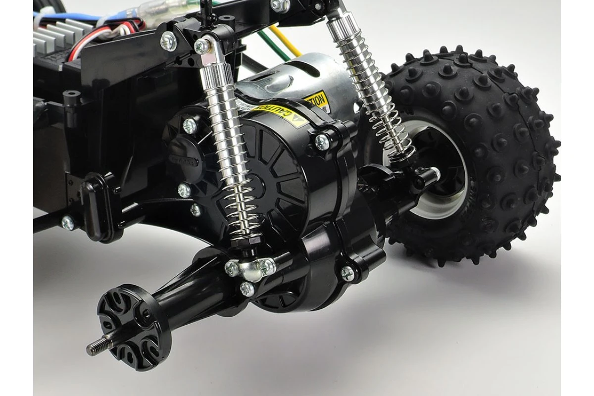 The model’s lightweight and durable chassis is based around a bathtub-type frame. It features front swing-axle suspension with friction dampers, while the rear is cushioned by a rolling rigid axle setup and oil dampers for excellent shock absorption. The differential is enclosed in a sealed gearbox to ensure that dust and dirt stay outside, allowing it to continue providing smooth cornering. Three-piece wheels give the car authentic buggy looks, with grooved front tyres and rear spike tyres guaranteeing superb performance on- and off-road.