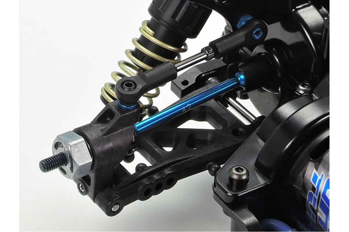 - Steel adjustable suspension mounts included. It uses plastic bushings which can be exchanged to allow a huge range of toe and roll center settings.
