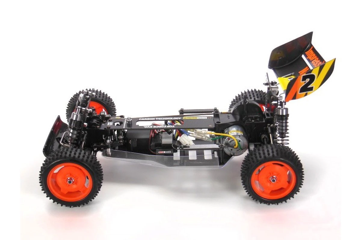 Designed to possess an ultra-low center of gravity, the Top Force Evo. sports a body that is both aerodynamic and cool to look at! The Top Force Evo. features front and rear sealed gearboxes, sandwiched between 2mm carbon fiber plates for dependable durability. Transmission system features a hard propeller shaft and front/rear ball diff. Double wishbone suspension comes with 4 Aluminum shock dampers, and is designed for ultimate adjustability. New to this release comes the choice of rigid and one-way counter gears for variable set up options.