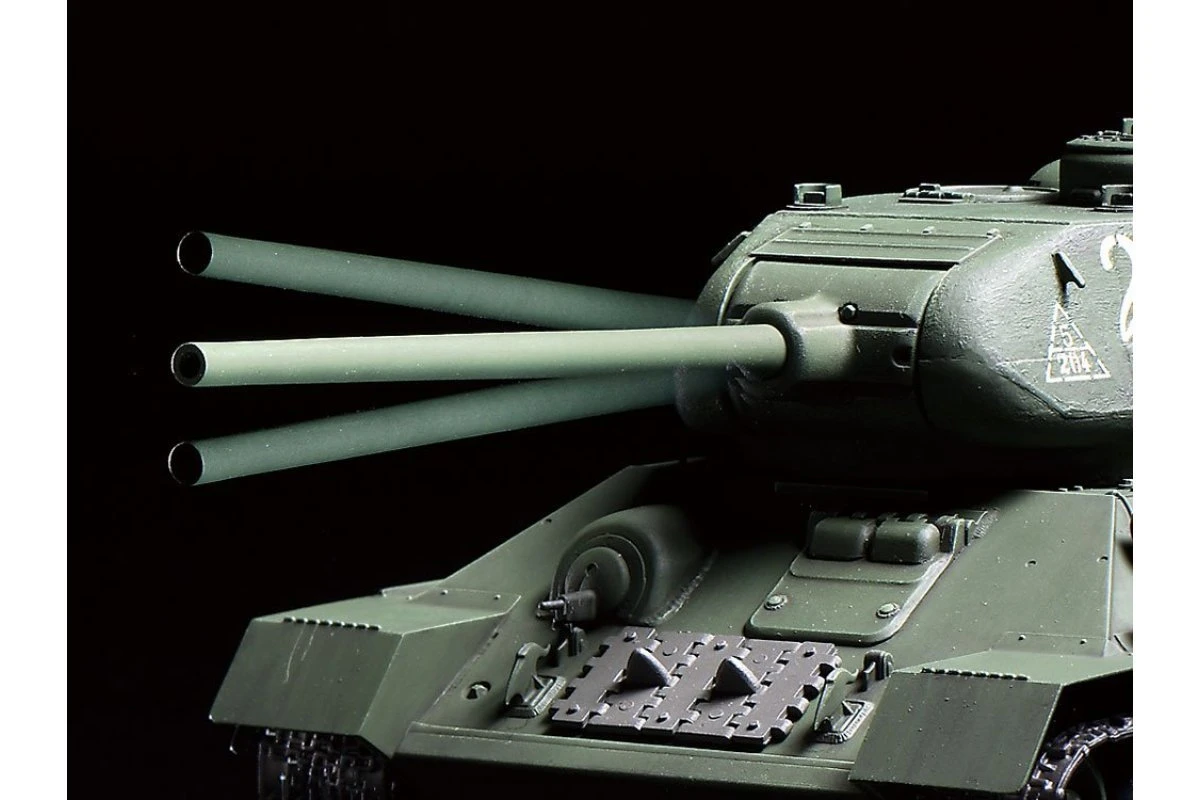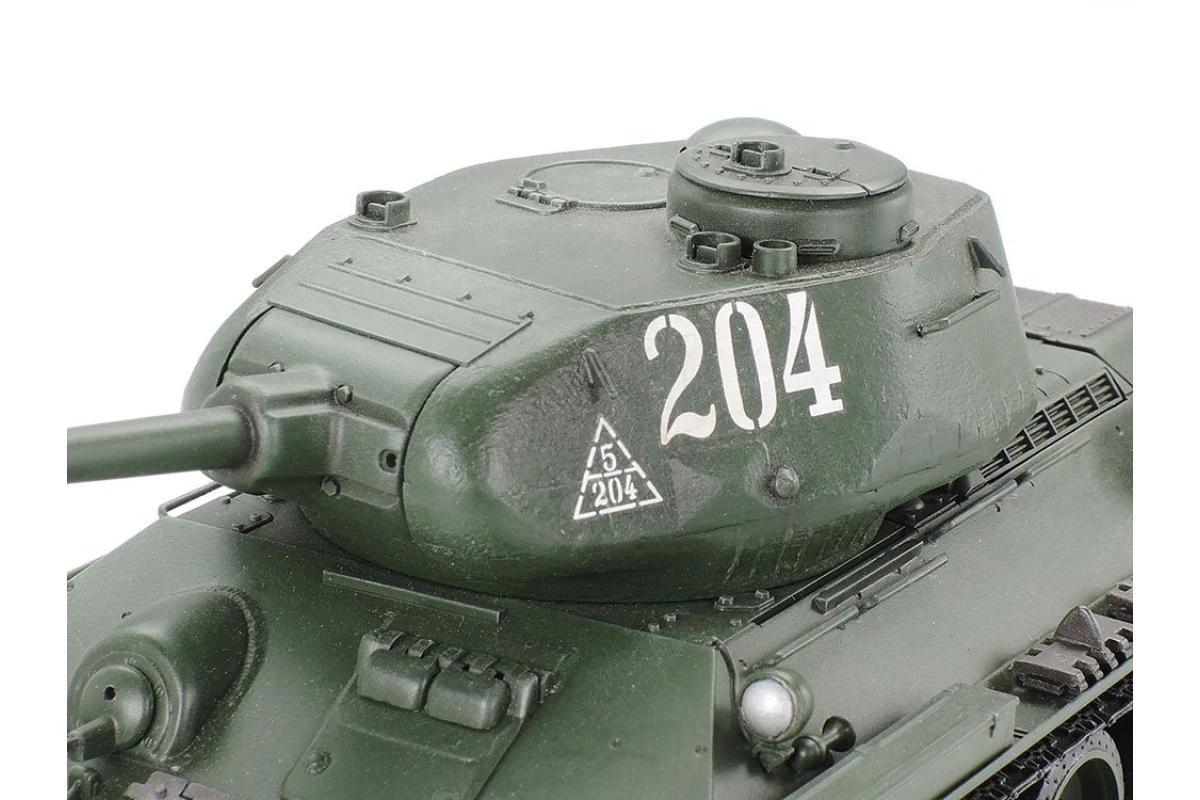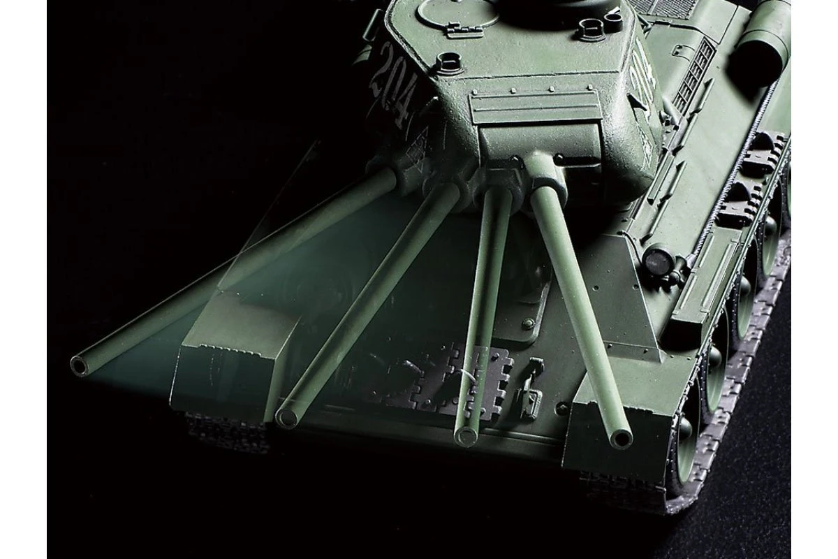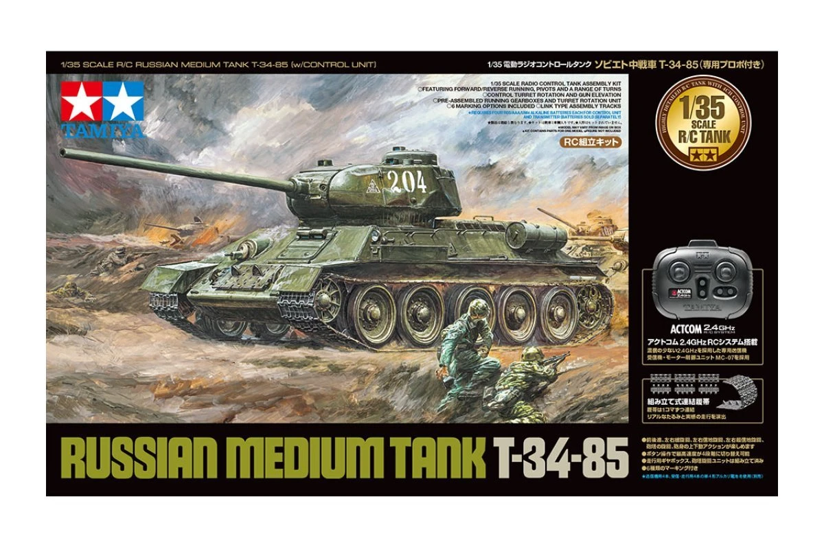 The Tamiya T-34-85 R/C model gets an updated re-issue with a modern transmitter and control unit set, plus new assembly type tracks! The T-34-85 was essentially an answer to the dominating German Tiger and Panther armor, and an effective one at that. Powered by an 85mm gun and defended by superbly sloped armor, it was manufactured from 1944 to 1946 and contributed to the Soviet march on Germany that helped bring the bloody conflict of WWII to an end.