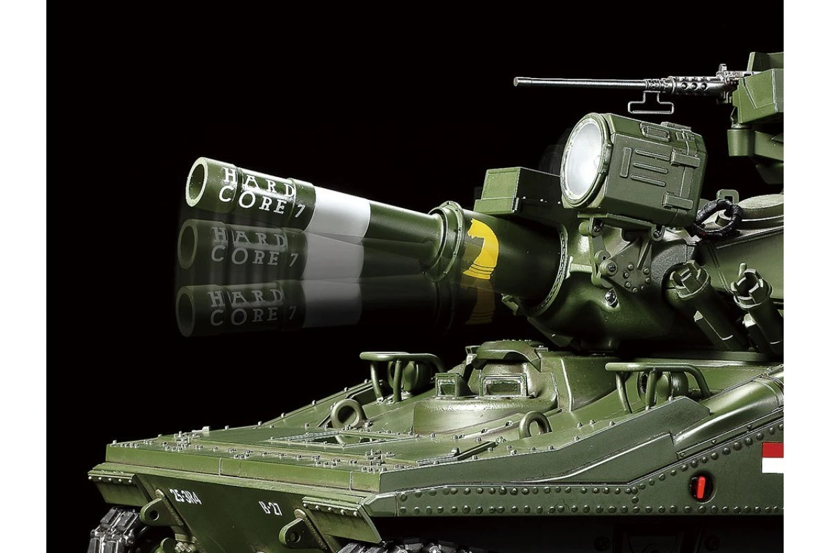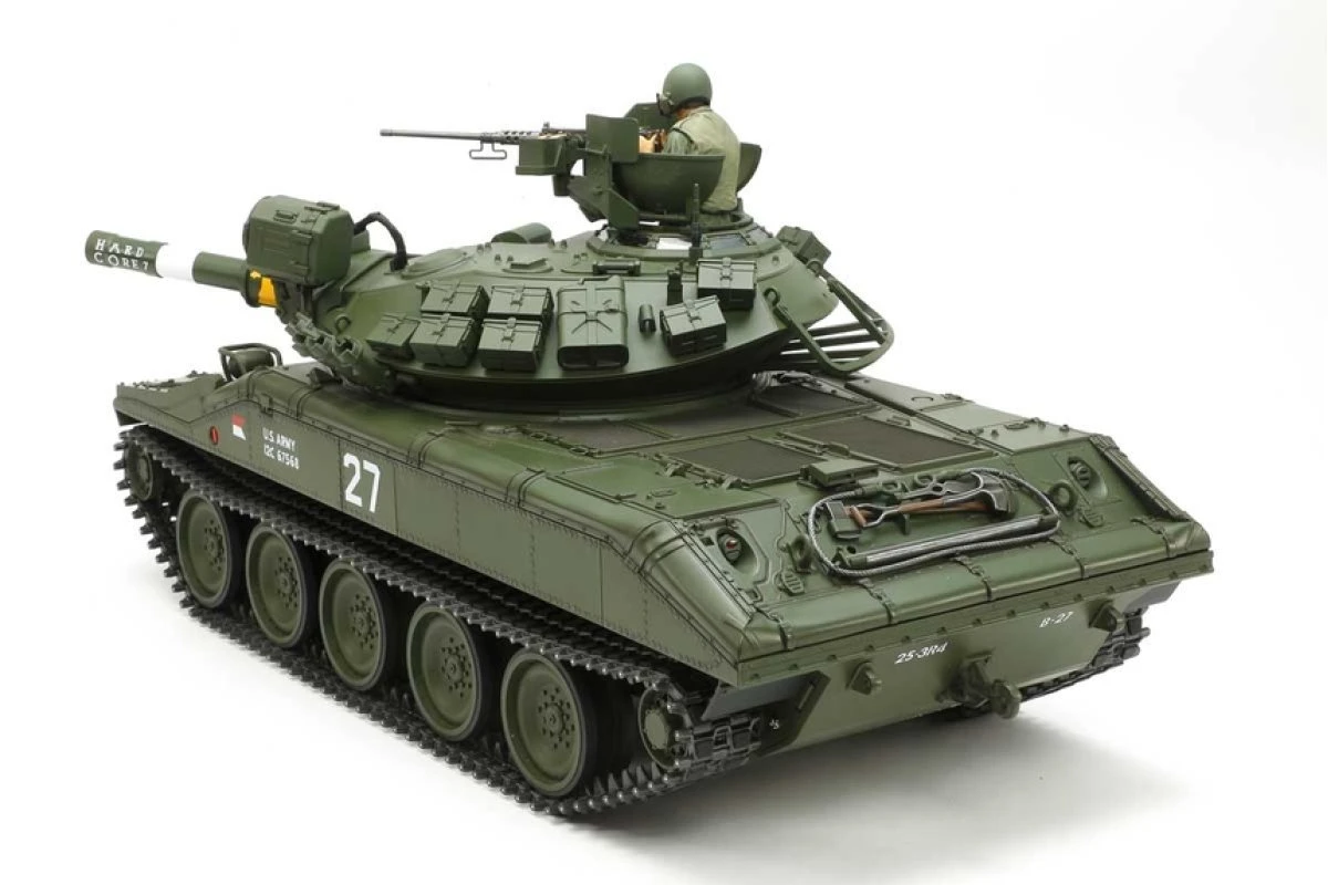This massive Tamiya R/C replica recreates the shape of the rather unique M551 Sheridan in 1/16 scale. The M551 was designed as airdrop capable armor with wading capabilities, a key concept as the U.S. took on the role of global policeman post-WWII. With an aluminum hull and rolled steel turret, it weighed just 15 tons, but had impressive firepower in the shape of the M81 152mm gun/launcher, which could fire standard rounds and MGM-51 Shillelagh missiles. The M551 was in service with active units from 1968 to 1996 and saw action in the jungles of Vietnam.