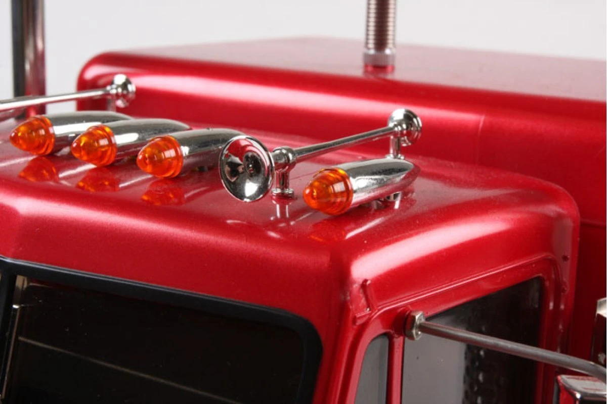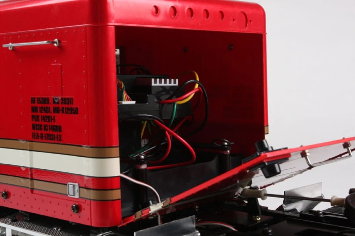 The Mighty King Hauler resembles the classic conventional American tractor truck. Powered by a 540 motor driven with a 3-speed transmission, which has no problem turning the dual rear axles. Each axle is supported with leaf spring and shocks. The metal C-Channel ladder frame, keeps the power to the pavement.