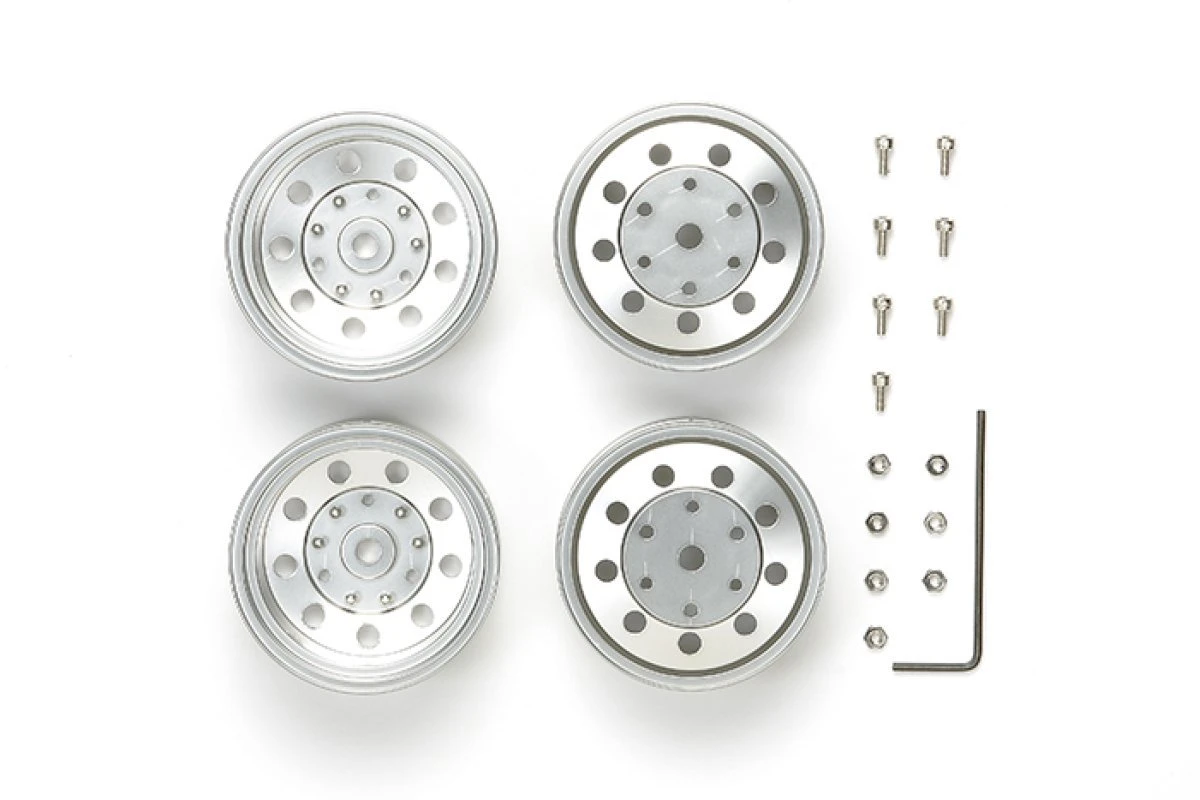Actual trucks used in logistics networks are often seen with plain natural metal wheels made of steel or aluminum. To depict this type of wheel, these matte finish metal-plated wheels for 1/14 scale R/C tractor trucks are available as an option wheel set. By simply replacing with kit-standard gloss finish metal-plated wheels, you can give your truck a different appearance. These wheels are designed for use with tires with 22mm width.