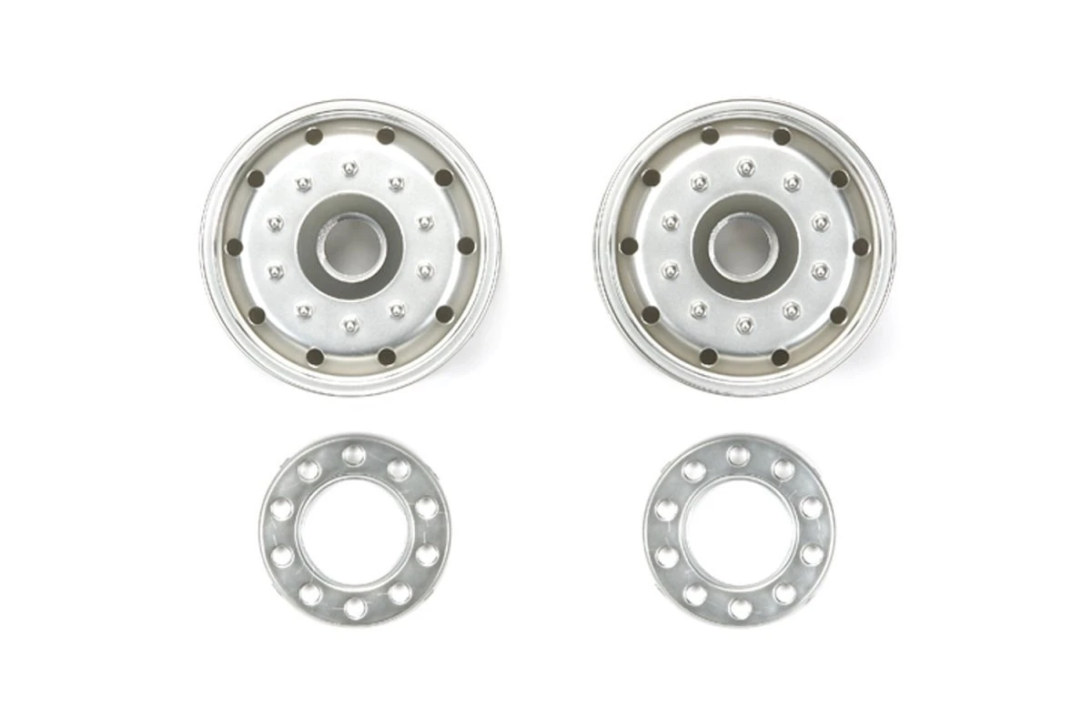 Actual tractor trucks are often seen with plain natural-metal wheels made of steel or aluminum. To depict this type of wheel, these matte finish metal-plated wheels for 1/14 scale R/C tractor trucks and semi-trailers are available as an option accessory. By simply replacing with kit-standard gloss finish metal-plated wheels, you can give your truck or trailer a different appearance.