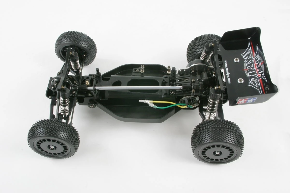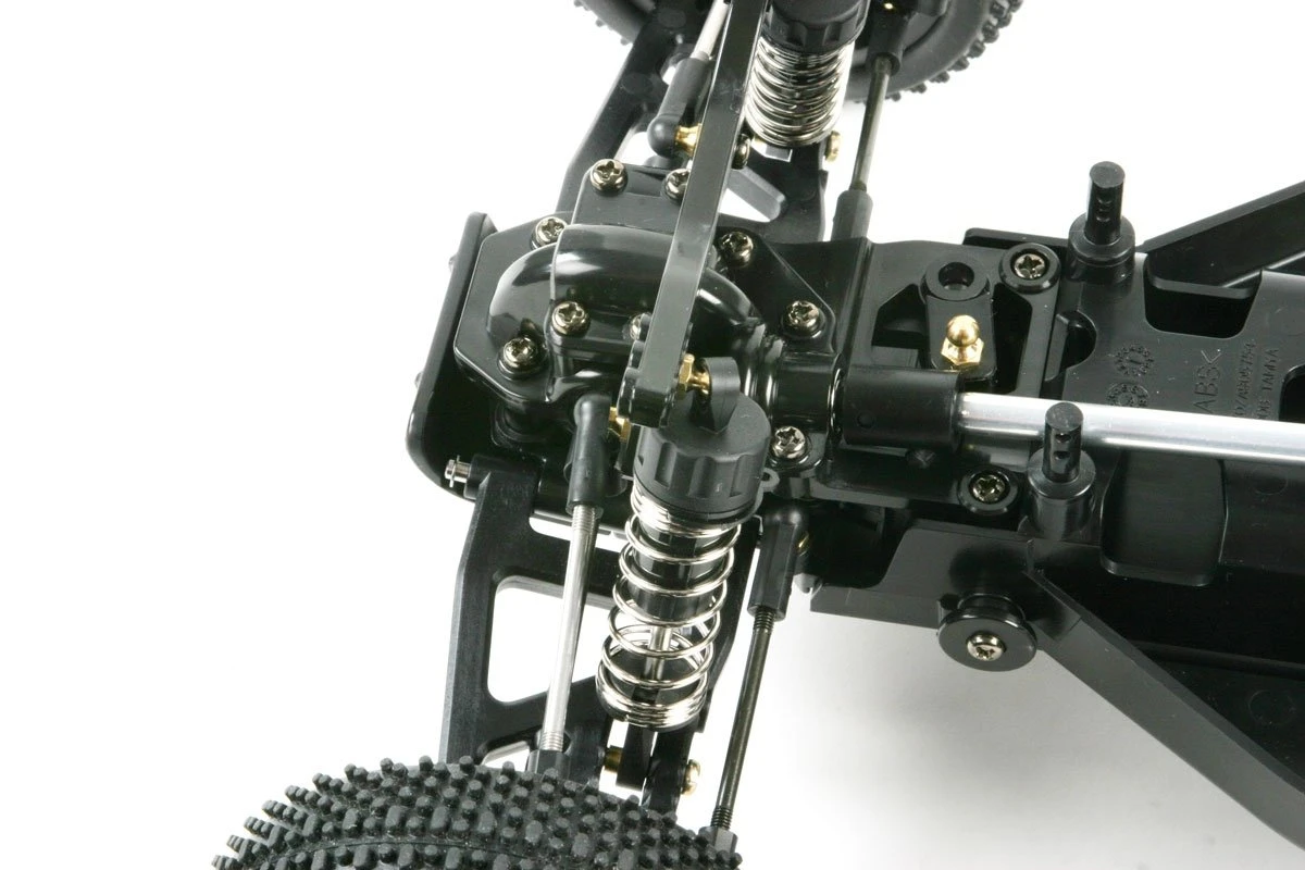 Durable monocoque bathtub frame sees the heavy battery and R/C mechanism components mounted low and central for the best vehicle balance. Even the oil dampers are located within the wheelbase for greater stability and cornering performance. Compact gearboxes are equipped with ball differentials, and the propeller shaft directly links to the front bevel gear to decrease power loss during transmission. 4-wheel double wishbone suspension with long suspension arms provides excellent shock absorption, and a variety of attachment positions gives the driver many options when tuning.