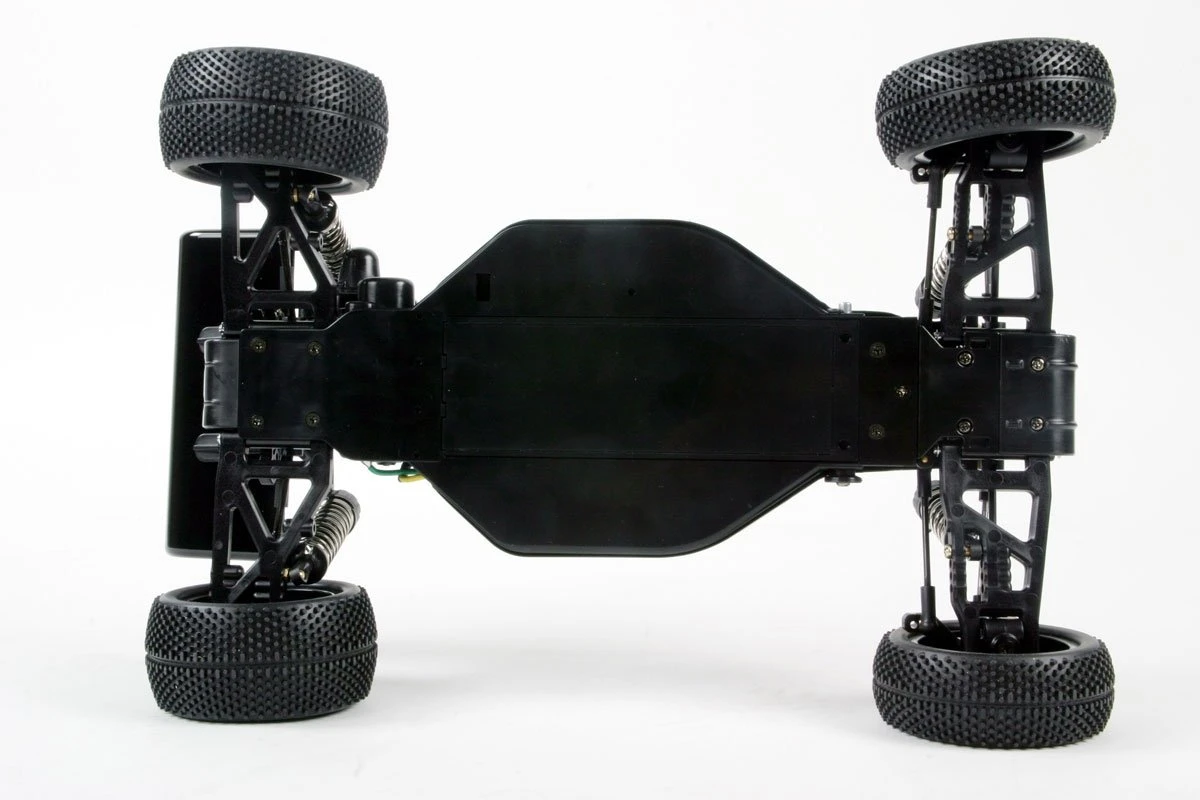 This 1/10 scale 4WD buggy is specially designed to excel in off-road buggy performance driving. It features a mid-rear mounted motor and longitudinally mounted battery for optimum balance for jumping. Battery is inserted through the bottom of the chassis, eliminating need to remove body, which makes routine maintenance easy and quick. High performance shaft drive 4WD combines with suspension system featuring extra-long suspension arms for improved stability and off-road handling.