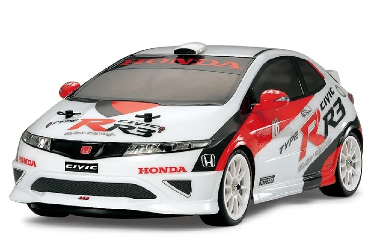 This is a 1/10 R/C assembly model kit of the Honda Civic Type-R R3 which was developed by Italian official Honda racing partner, J.A.S. Motorsport. The form of the 3-door hatchback, which features an air-intake on the roof, has been realistically reproduced. Parts including the roof’s air-intake, side mirrors, and rear spoiler are reproduced with separate parts to provide the model with a sharper presence. The kit includes sticker sheet to faithfully reproduce the red and dark gray livery and the Type-R logos. The Honda Civic Type-R comes loaded on the front wheel drive FF-03 chassis.