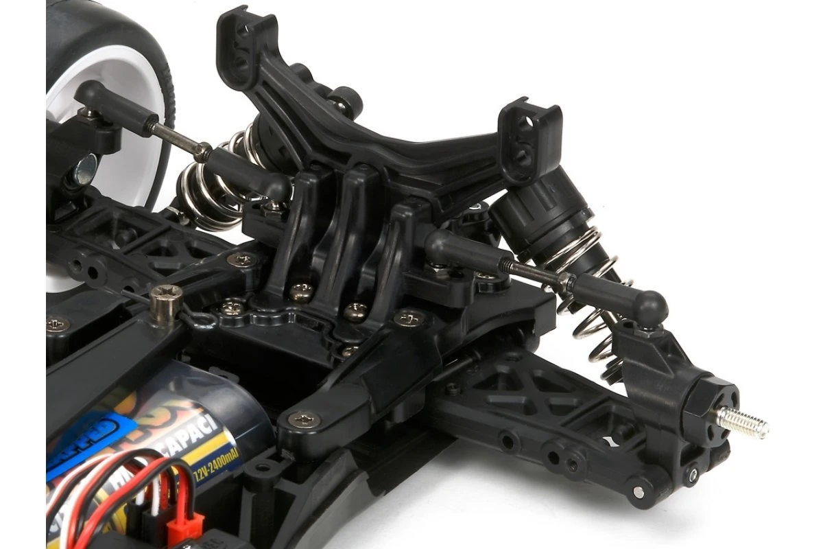 - The longitudinal battery layout enables a slim chassis design. R/C units are loaded on each side for optimum balance.