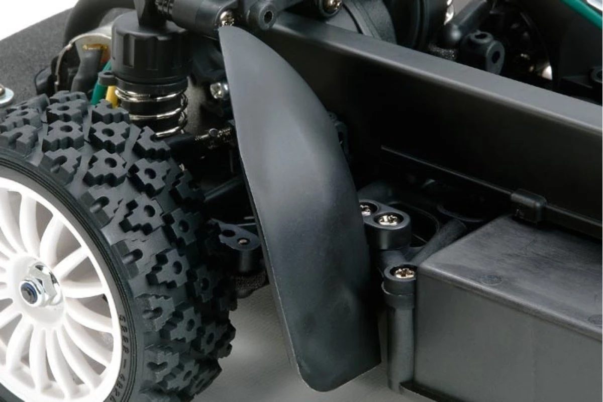The XV-01 chassis offers exciting R/C driving action on both on- and off-road surfaces. It features a front-motor, belt-driven 4WD layout with the gearboxes, drive belt, battery, and R/C unit areas protected by covers against dirt and debris. Holes in the bottom of the chassis further help remove any debris which manages to get onboard, ensuring unhindered off-road performance. Long steering linkage provides stable wheel alignment. In addition, detachable wheel well liners help prevent mud and gravel intrusion. Gear differential units enable customization with different viscosities of differential oils.