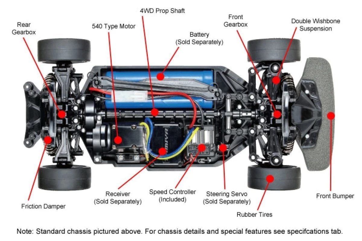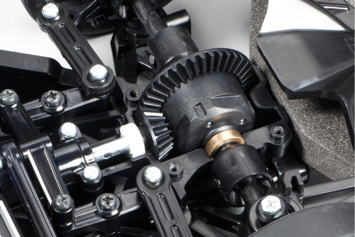 The shaft driven 4WD TT-02 chassis employs a longitudinal layout with the battery on the left and the motor on the right, offering excellent stability. In addition, it features identical left and right suspension arms and uprights for ease of assembly and easy-to-maintain gearboxes. It is a highly adaptable chassis, as it offers 2 different wheelbases, 2 ground clearance settings, 2 tread set-ups and a range of 10 possible gear ratios. It is not short on looks either, with brake disc-shaped wheel hubs and stylish front bumper supports.