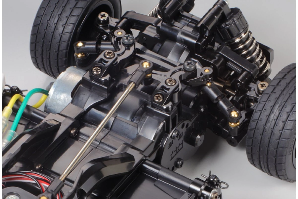 The Tamiya R/C model faithfully captures the fun and maneuverability of the real life subject as it comes on the proven M-05 M-chassis platform. The M-05 is a simple to build FWD (front wheel drive) machine, which allows for plenty of after-market parts to be outfitted as you grow with your skill. The lightweight, narrow semi-monocoque frame offers an optimized weight distribution and a low center of gravity. A ground-hugging 4-wheel independent double wishbone suspension and a 3-piece steering linkage ensure excellent stability during high-speed cornering.Â