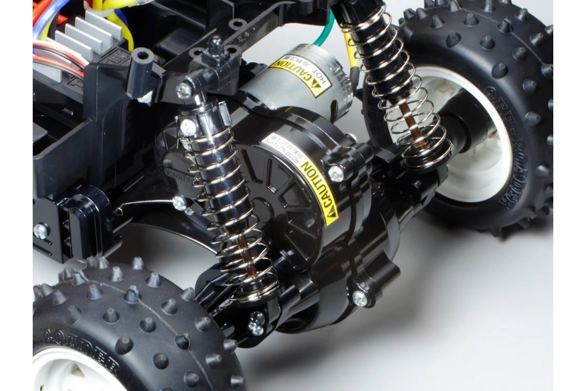 A rugged ABS resin chassis is more than up to the stresses of off-road driving, and features lightweight durable plastic suspension arms, gearboxes and so on – the result is a lightweight and durable unit. Front swing axle and rear rolling rigid suspension combine for a responsive drive, while a fully enclosed gearbox is integrated with the rear axle and has a built-in differential gear to aid smooth cornering. One-piece wheels are paired with front grooved and rear spike tires for solid performance.