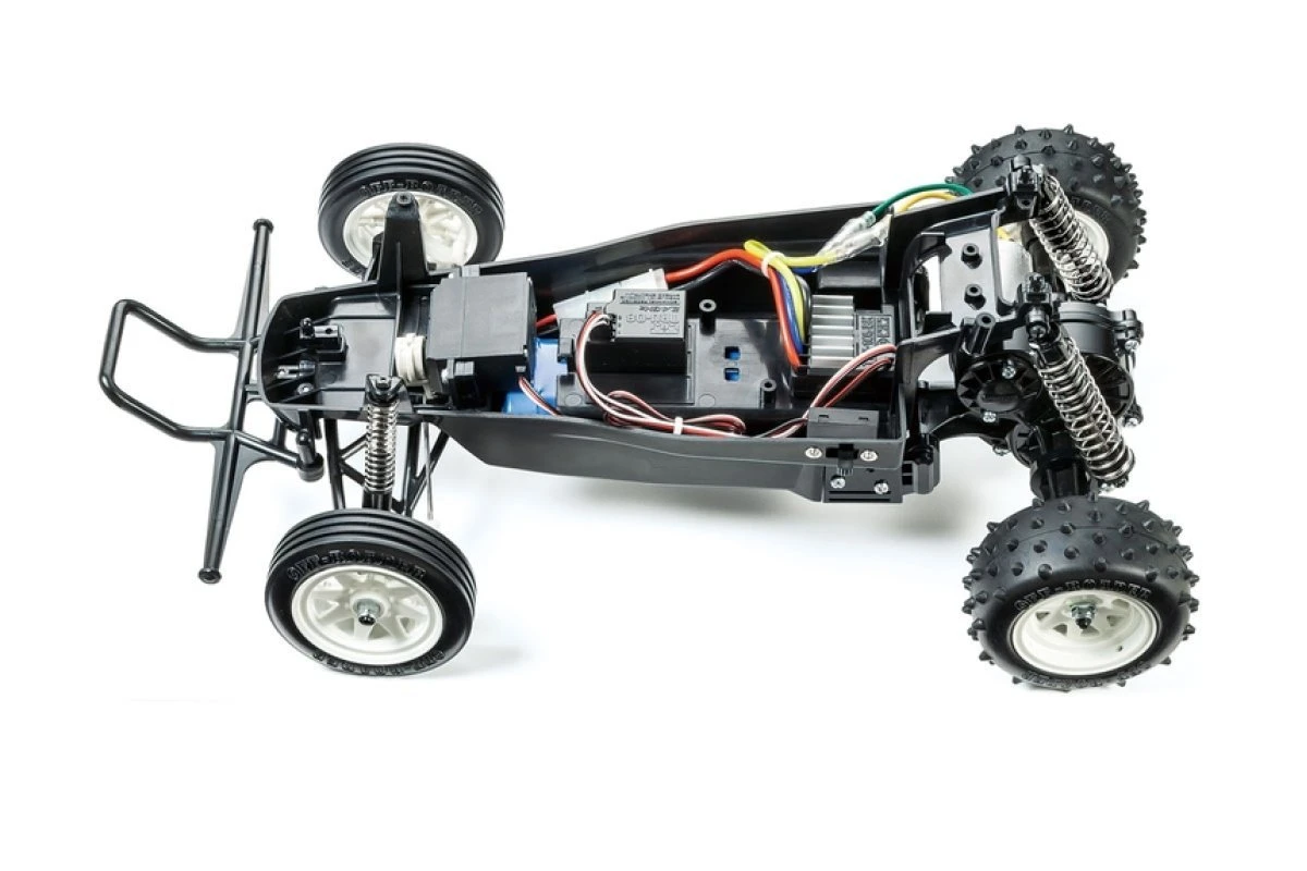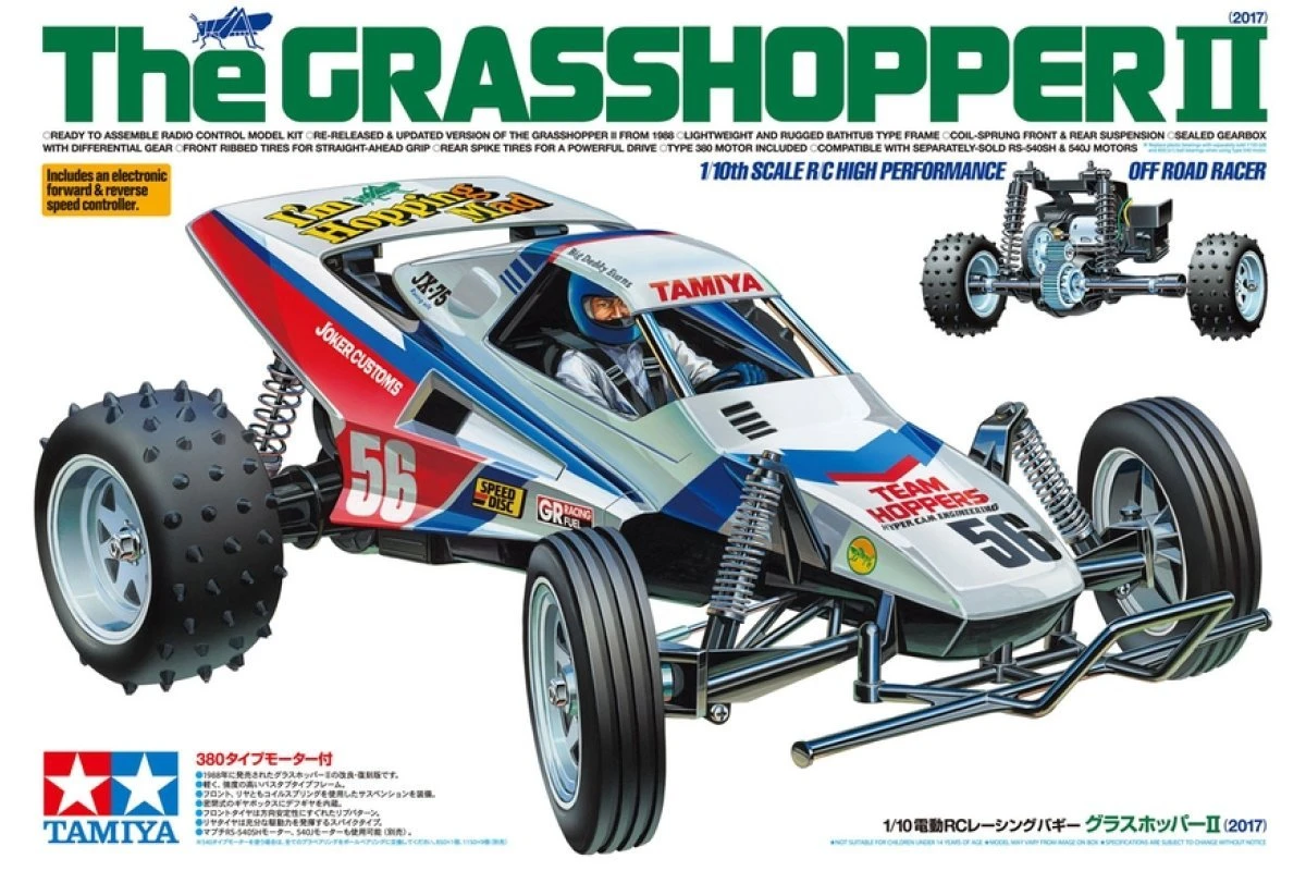The Grasshopper II is one of Tamiya’s iconic radio control car kits from the late 1980’s. It was an enhanced follow up release to the original Grasshopper kit. This re-release (2017) kit features a number of updates while keeping largely faithful to the original model. Its streamlined construction process makes this kit perfect for less experienced users and R/C veterans alike, while separately sold option parts can be used to enhance the model.