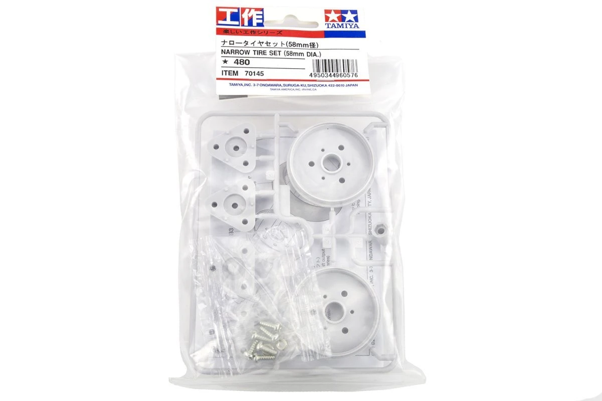 The Narrow Tire Set works well in on-road conditions. Two sets of hubs have been included along with a wrench to change the hubs. One set of hubs is for hex shafts like those on many of Tamiya’s gear boxes, and the other set of hubs is for round shaft applications.