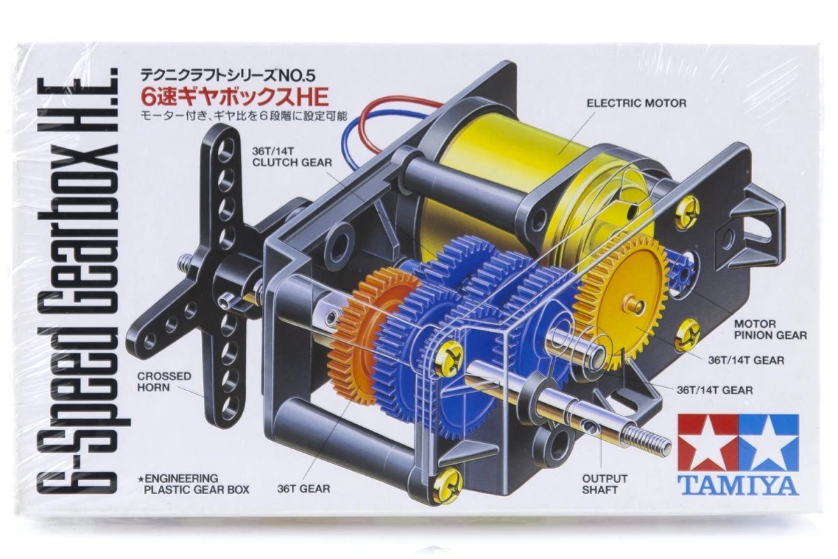 This precision 6-Speed Gear Box, High Efficiency, is a compact unit with a variety of gear ratio options to choose from. Several crank arms and a RE-260 motor are included. Perfect for many Tamiya Construction and Robotics projects.